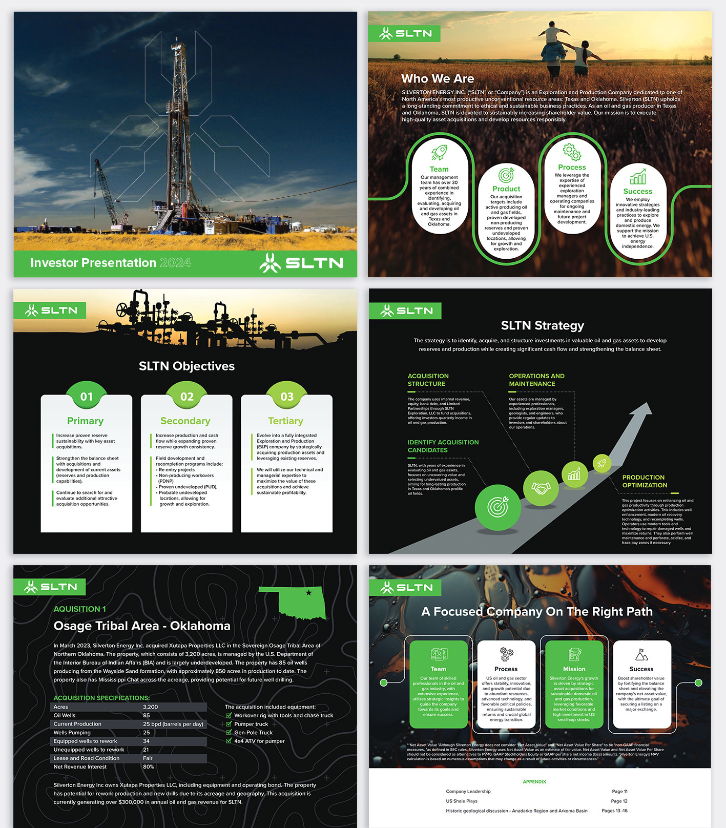 SILVERTON ENERGY is an Exploration and Production Company dedicated to one of North America’s most productive unconventional resource areas: Texas and Oklahoma. Silverton (SLTN) upholds a long-standing commitment to ethical and sustainable business practices. As an oil and gas producer in Texas and Oklahoma, SLTN is devoted to increasing shareholder value sustainably. The mission is to execute high-quality asset acquisitions and develop resources responsibly.